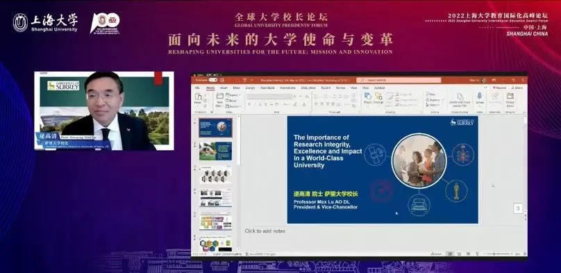 萨里大学校长逯高清在《在世界一流大学中,科研诚信、追求卓越和扩大影响的意义》报告中强调,在衡量一所大学的影响力和声誉时,不仅要看其科研成果,还要着眼于它在应对全球挑战、解决当地与全球社区和产业面临的紧迫问题等方面的实际贡献。