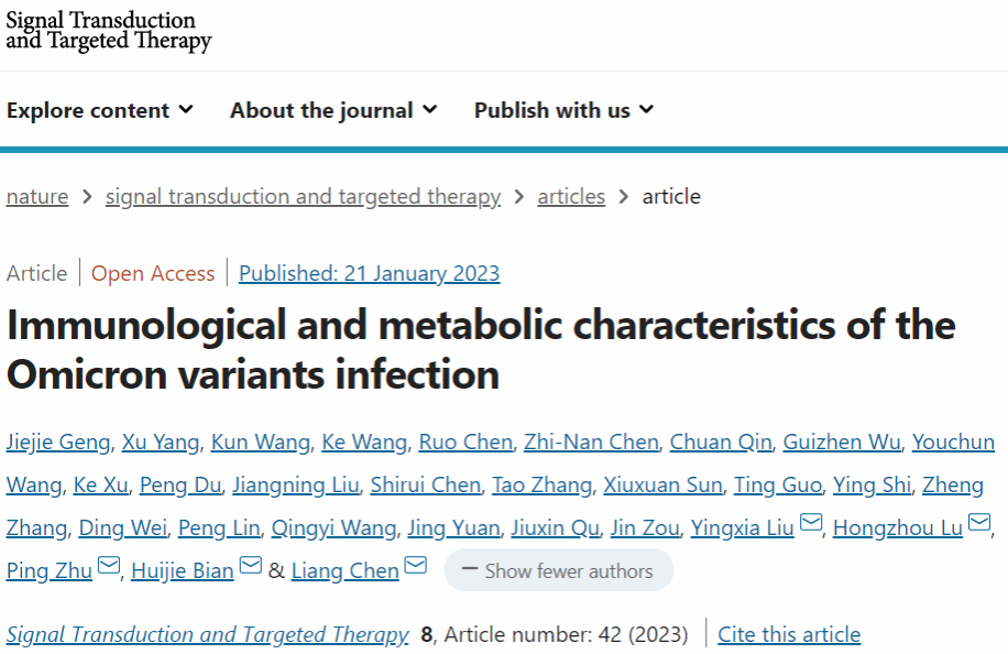此前,在2023年1月12日,陈亮教授作为通讯作者,与空军军医大学朱平教授,边惠洁教授,深圳市第三人民医院刘映霞教授,卢洪洲教授合作,在《Signal Transduction and Targeted Therapy》(IF=38)在线发表题为“Immunological and metabolic characteristics of the Omicron variants infection”的研究论文,系统地研究了Omicron变异感染的免疫和代谢特征。