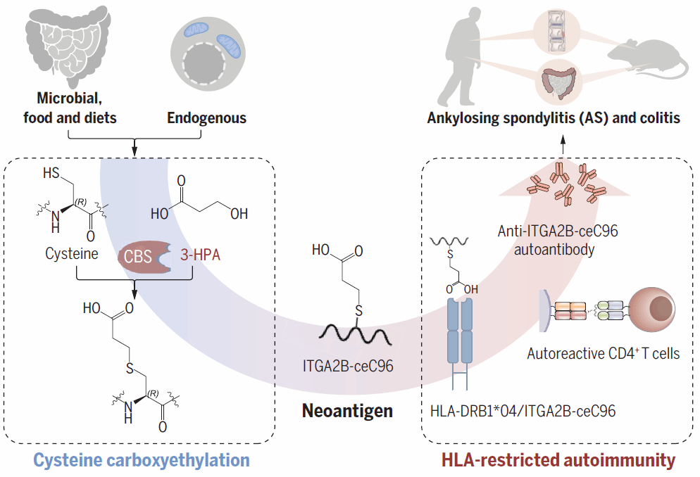 该研究首次发现并鉴定了一种全新的蛋白质翻译后修饰(PTM)——半胱氨酸羧基乙基化修饰。当半胱氨酸与3-羟基丙酸(3-HPA)结合形成硫醚键时,就会产生半胱氨酸羧乙基化修饰,这一反应需要由胱硫醇β合酶催化。在这些修饰中,整合素96位半胱氨酸(ITGA2B-96Cys)的羧乙基化修饰激活了溶酶体降解途径,产生羧乙基化ITGA2B修饰肽,并增强了HLA-DR4复合物中该修饰肽的募集。这种修饰肽是CD4+ T细胞反应敏感的新生抗原,可引起人类白细胞抗原(HLA)免疫反应。该研究结果揭示了AS自身免疫病发病的全新分子机制。