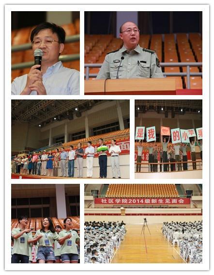 8月23日晚,社区学院2014级新生见面会在校本部体育馆举办。军训师总指挥、校党委常委、组织部部长徐旭,军训师副师长、武装部部长兼保卫处处长沈龙骥,军训师副政委、学工办主任王军华,军训师副政委兼政治部主任、组织部副部长兼校团委书记胡大伟出席见面会,对同学们在军训期间的良好表现表示最诚挚的慰问。社区学院导师,社区学院党政领导、各工作团队、新世纪社区管理部管理员与2014级社区学院全体学生面对面交流。
