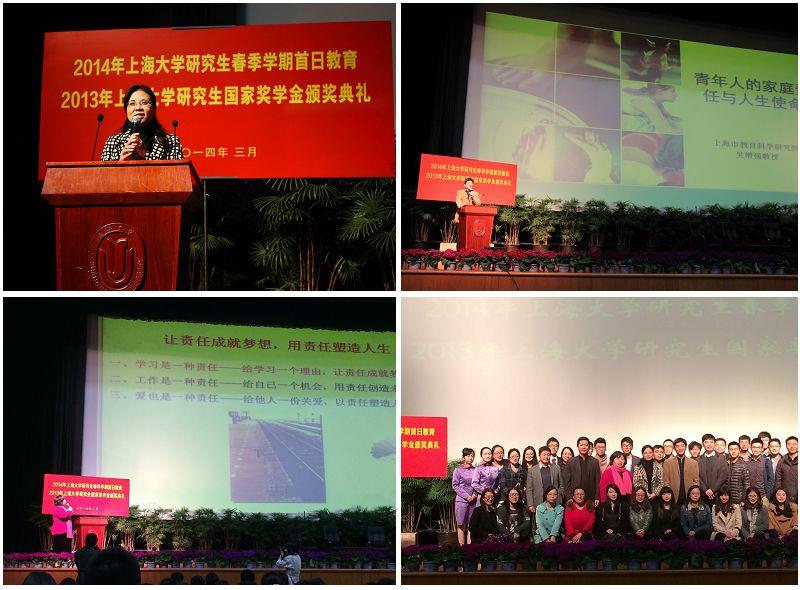 首日教育最后,副校长,研究生院常务副院长吴明红讲话。她与研究生同学们分享了自己对于责任的理解,希望大家能够用积极良好的心态面对方方面面的压力,树立正确的就业观、家庭观,承担起社会责任和家庭责任。同时,吴校长还对获得国家奖学金的研究生们表示祝贺,希望全体研究生向他们学习,承担起学习责任,做一个勇于担当的上大人!