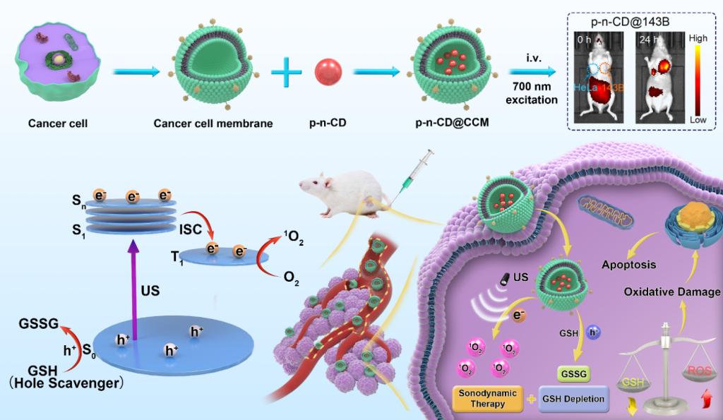 潘登余、耿弼江等人首次提出了“磷光声敏剂”的概念,设计制备了一种新型近红外磷光碳点,将其应用于近红外成像介导的精准声动力肿瘤治疗。该团队采用一步微波合成策略调控碳点导电类型,制备的同质p-n结碳点不仅具有近红外磷光特性,而且具有增强的声动力活性。其优异的声动力活性体现在:1)p-n结可高效抑制电子空穴对的复合;2)激发的长寿命三重态可高效产生单线态氧;3)激发的空穴可高效消耗肿瘤微环境中的谷胱甘肽。最后,采用具有同源靶向特性的癌细胞膜封装近红外磷光碳点,通过单次静脉注射和单次超声,在荷瘤鼠模型中实现了对骨肉瘤的完全根除。该工作不仅为磷光材料长寿命三重态用于近红外成像介导的声动力治疗开辟了一条全新途径,也为量子点磷光材料应用于近红外发光器件提供了新思路。