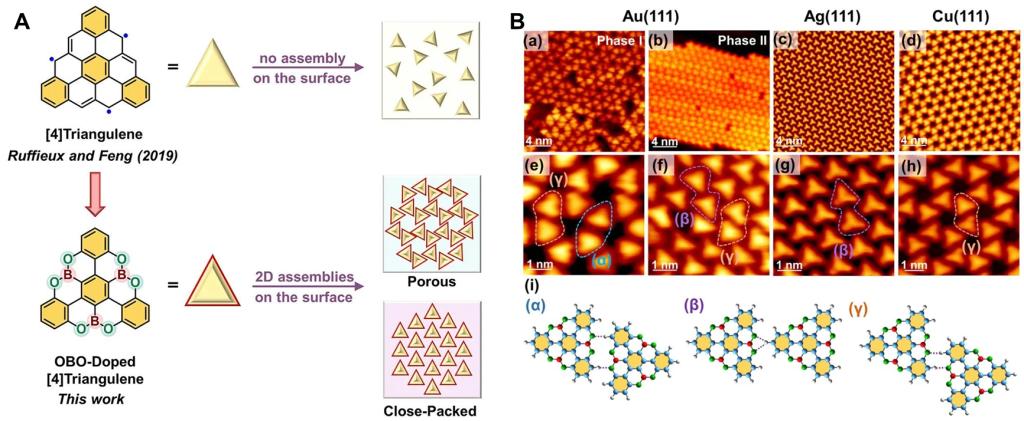 图2:A.已有的[4]三角烯和本文报道的硼氧杂[4]三角烯及其在不同基底上的组装形貌示意图;B.(a–h)OBO三角烯在不同基底上组装体的STM图像;(i)基于不同组装结构的二聚体模型。