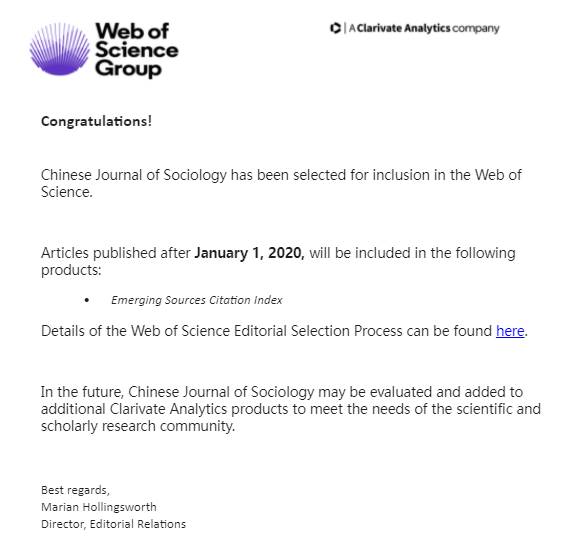 Emerging Sources Citation Index (ESCI) 是汤森路透公司于2015年发布的数据库,是Web of Science(WoS)核心合集中的子集之一,致力于向全球研究者提供优质的期刊数据资源,是经过严格评估筛选出的高质量、同行评议期刊的索引数据库。ESCI旨在拓展WoS的出版物收录范围,主要收录已产生较大影响力的高质量、同行评审出版物。进入ESCI数据库之后,CJS会接受WoS的定期评估,持续表现良好将被SSCI直接收录。