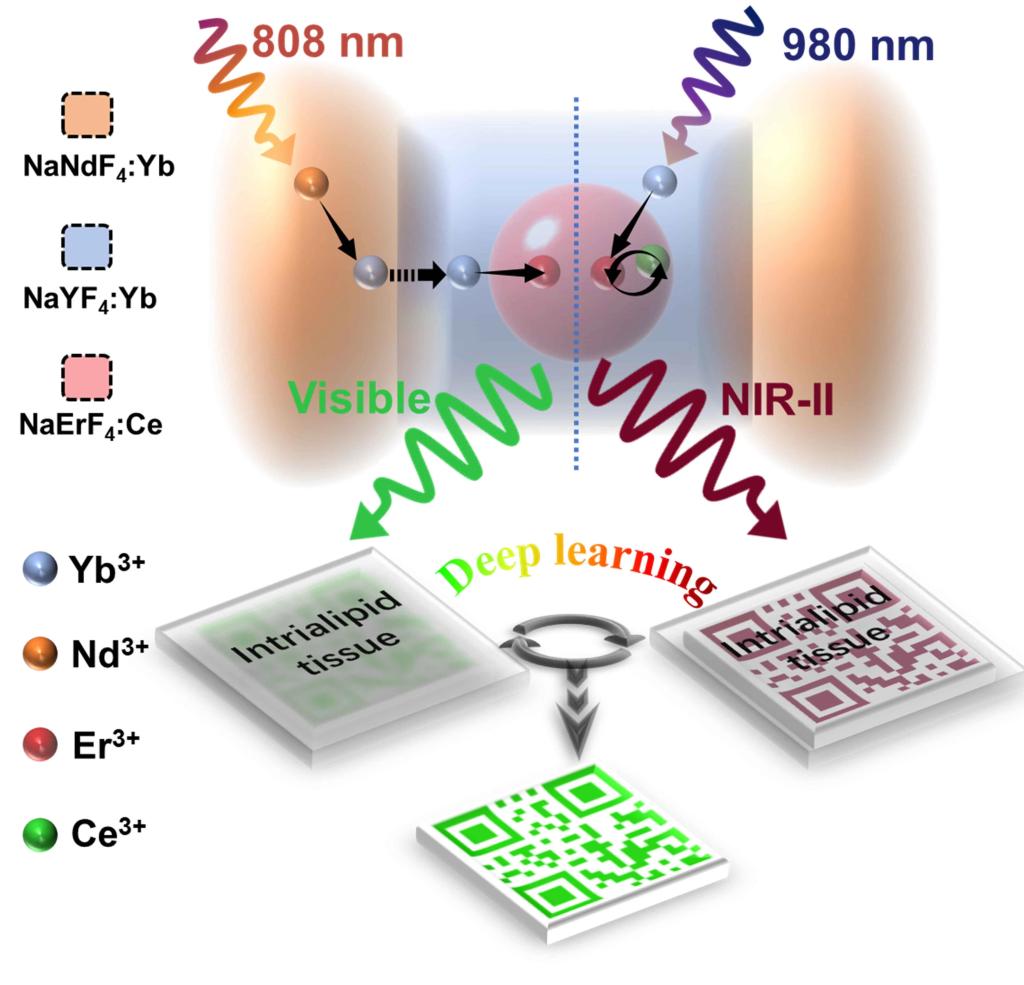 图1 哑铃状稀土多模发射纳米晶用于深度学习荧光成像的示意图