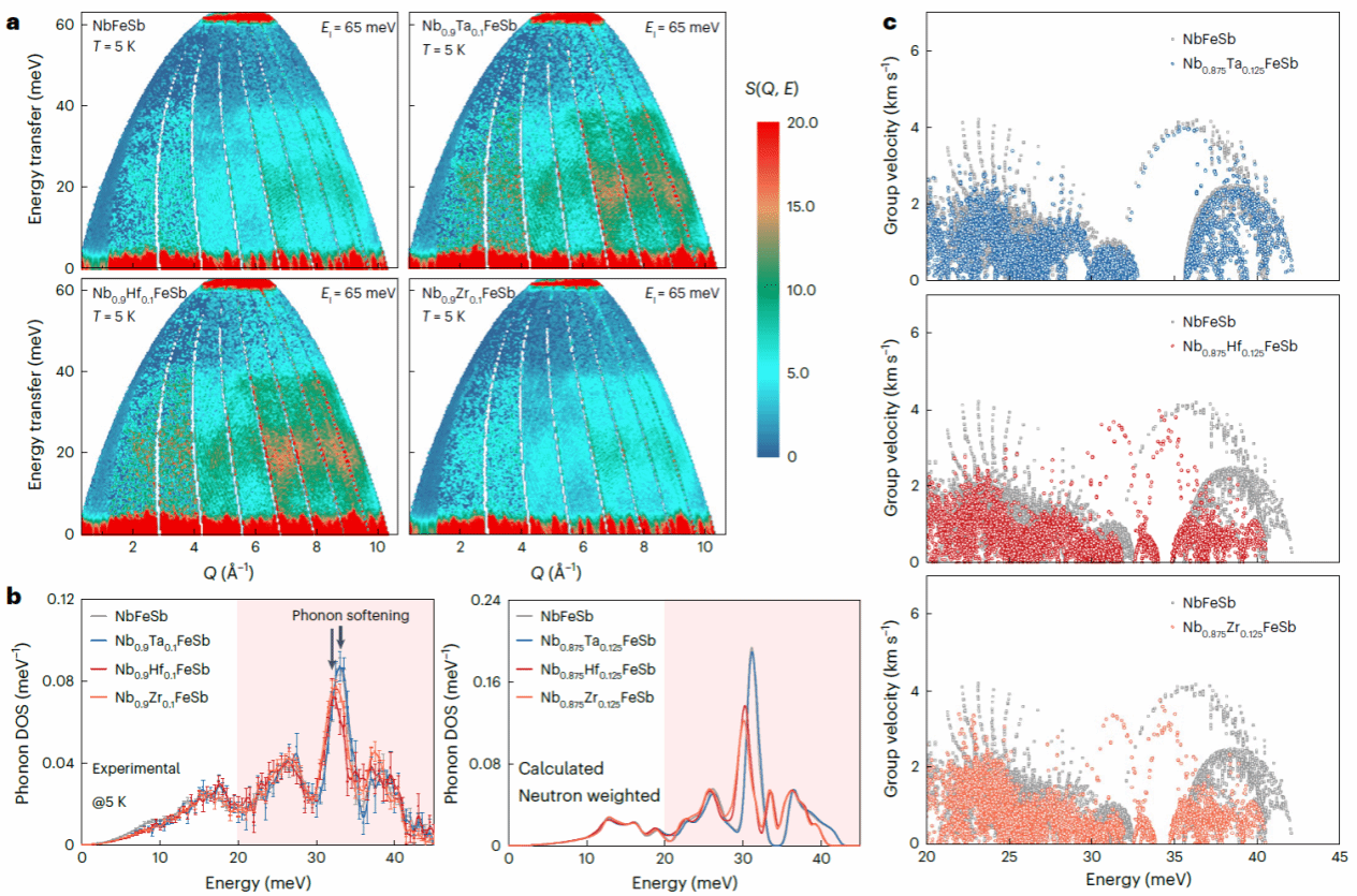 该成果以杨炯教授团队对掺杂体系的声子结构,热输运性能等第一性原理计算为重要分析手段,通过理论与实验相结合进行深入研究。以目前半赫斯勒合金中p型性能最优的NbFeSb基重带热电材料作为研究对象,将10%浓度的异价掺杂和共电子合金化的实验样品的全温度范围晶格热导率,与第一性原理计算的Nb0.875X0.125FeSb(X=Ti;Zr; Hf)结果进行交互对比分析,发现10%的异价掺杂在室温下实现的65%晶格热导率抑制主要源自异价掺杂带来的声子群速度的下降(图1)。通过非弹性中子散射技术对不同掺杂/合金化样品的声子态密度进行直接观测,发现异价掺杂引入显著的光学声子软化,且软化能量范围与理论计算吻合(图2)。除了带来光学声子软化之外,具有较重原子质量的Hf元素在较低声子能量范围还引起了声学声子和光学声子的“avoided crossing”效应(图3),导致声子色散关系发生变化,声子群速度显著下降,进一步抑制了材料的晶格热导率。
