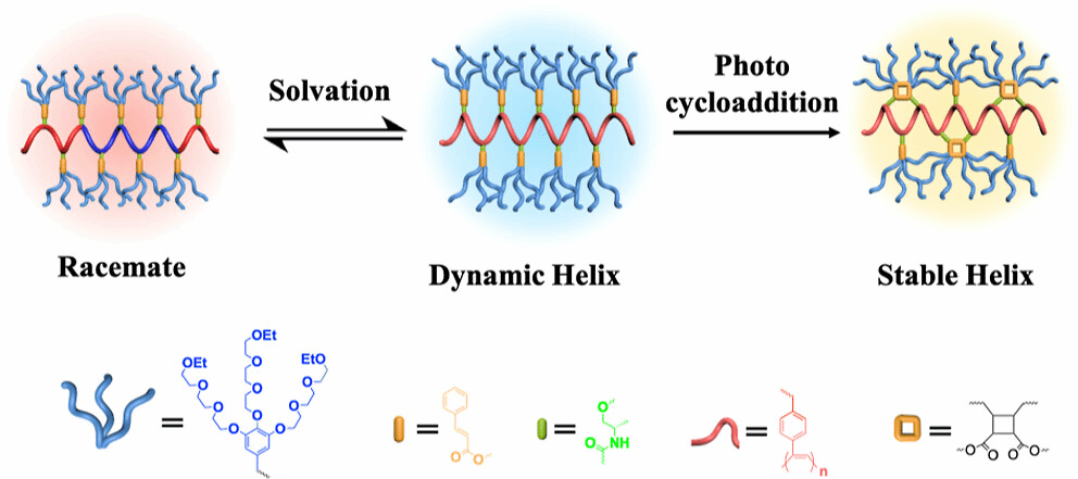 动态螺旋聚合物由于较低的构象势垒,主链螺旋构象可被外界刺激所操纵,然而稳定的手性对于实现螺旋聚合物手性功能与应用至关重要。精准调控并稳定螺旋构象一直是螺旋聚合物领域的重大挑战之一。