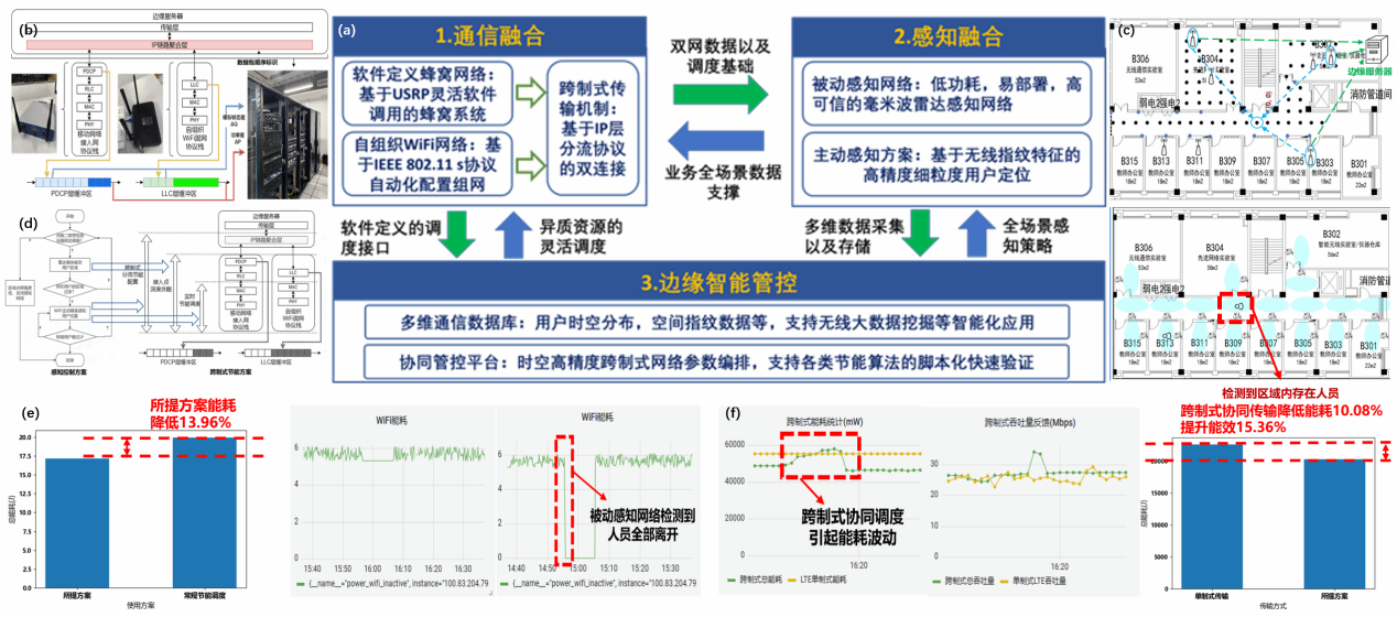 (a)高能效跨制式通感系统核心技术总览,(b)通信融合跨制式IP分流传输机制,(c)感知融合主被动定位方案,(d)边缘协同管控平台高精度网络编排,(e-f)深度休眠以及跨制式调度策略降低能耗效果。