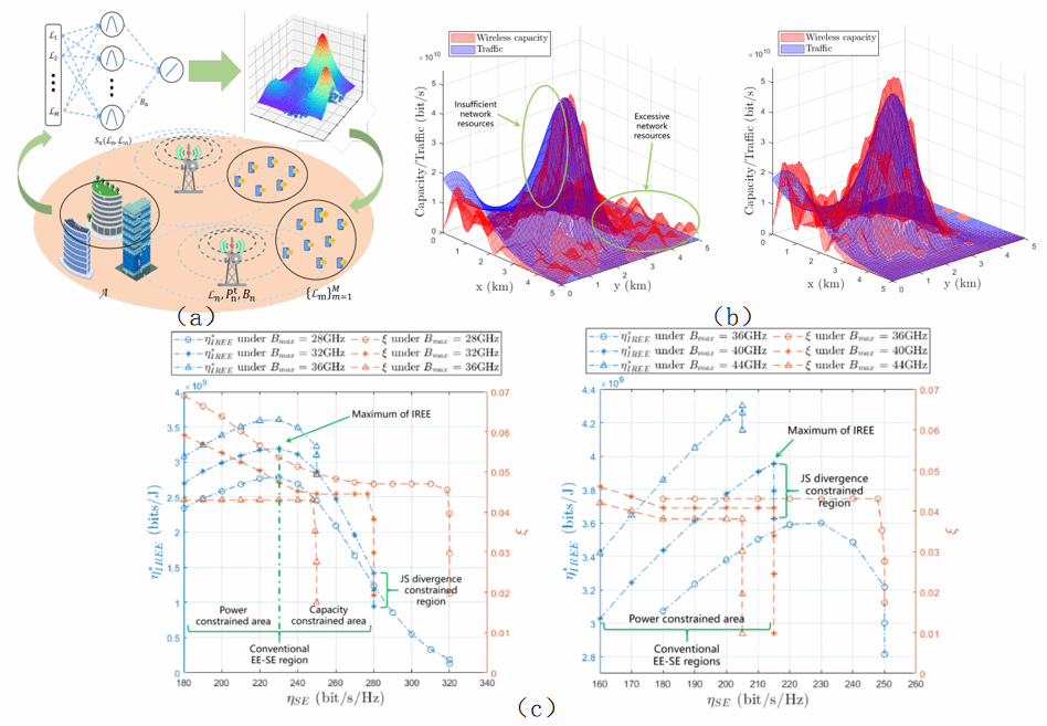 (a)6G无线网络场景,可以将各个基站看做径向基神经元,对无线流量进行拟合;(b) 传统EE最大化方案(左) vs IREE最大化方案(右)下的网络容量和流量分布,可以看出面向IREE的设计能够有效降低资源浪费;(c) 不同带宽限制下的集成相对能效-谱效折中关系