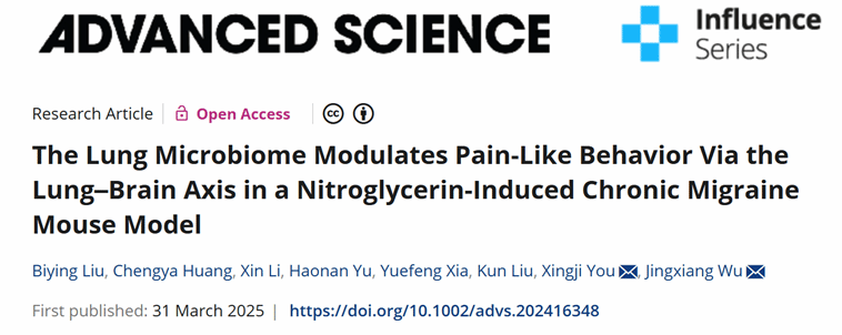 近日,上海交通大学胸科医院麻醉科吴镜湘教授&黑人巨大精品欧美_黑人巨大精品欧美黑寡妇_黑人巨大精品欧美一区二区_黑人巨大精品欧美一区二区免费_黑人巨大跨种族video_黑人巨大无码中文字幕无码_黑人巨茎大战俄罗斯美女_黑人巨茎大战俄罗斯美女医学院游兴姬副教授研究团队在综合性TOP期刊《Advanced Science》(中科院期刊1区,IF=14.3),发表了名为“The Lung Microbiome Modulates Pain-Like Behavior Via the Lung–Brain Axis in a Nitroglycerin-Induced Chronic Migraine Mouse Model”的研究论文,黑人巨大精品欧美_黑人巨大精品欧美黑寡妇_黑人巨大精品欧美一区二区_黑人巨大精品欧美一区二区免费_黑人巨大跨种族video_黑人巨大无码中文字幕无码_黑人巨茎大战俄罗斯美女_黑人巨茎大战俄罗斯美女医学院为该论文的共同通讯作者单位。