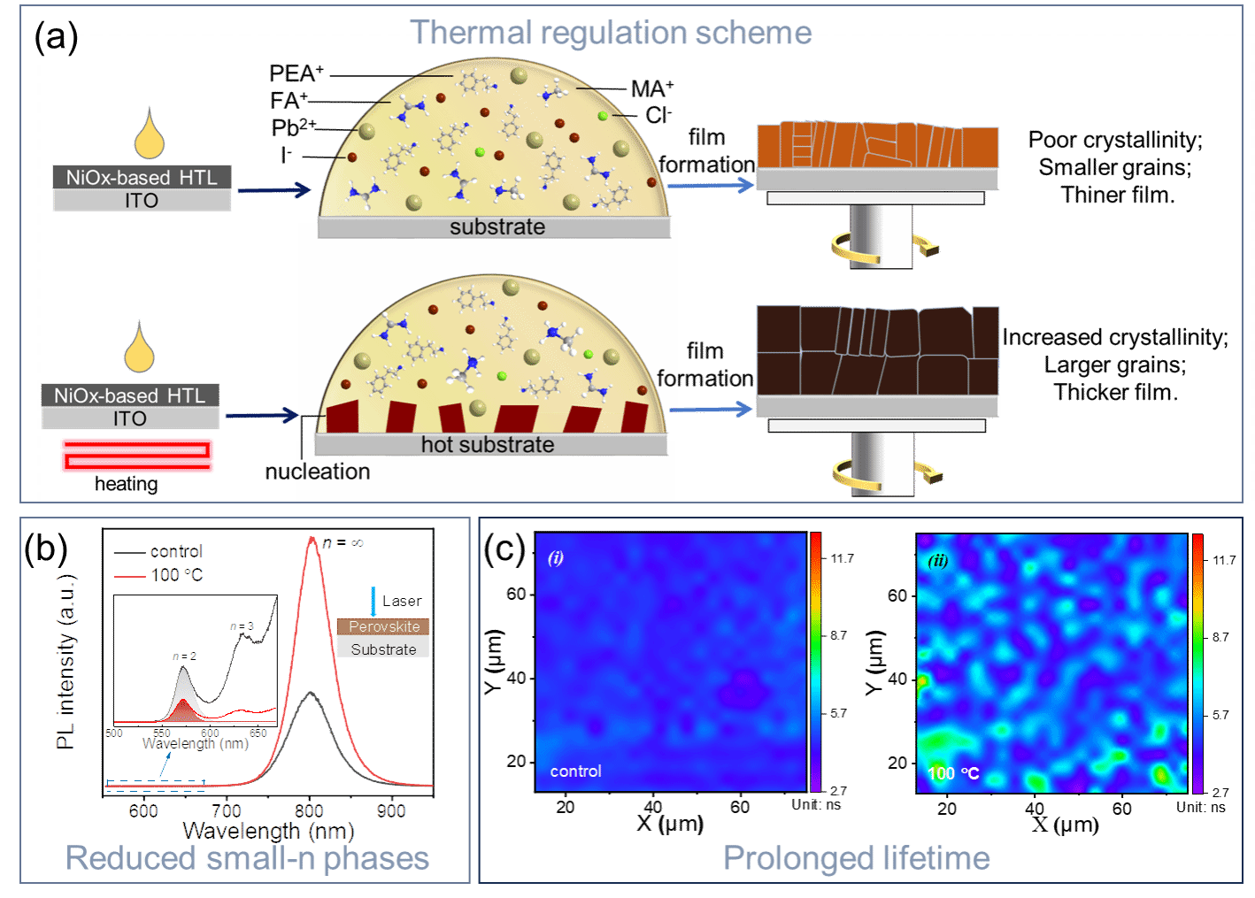 图1(a)热调控示意图;(b)PL光谱;(c)TRPL mapping图。