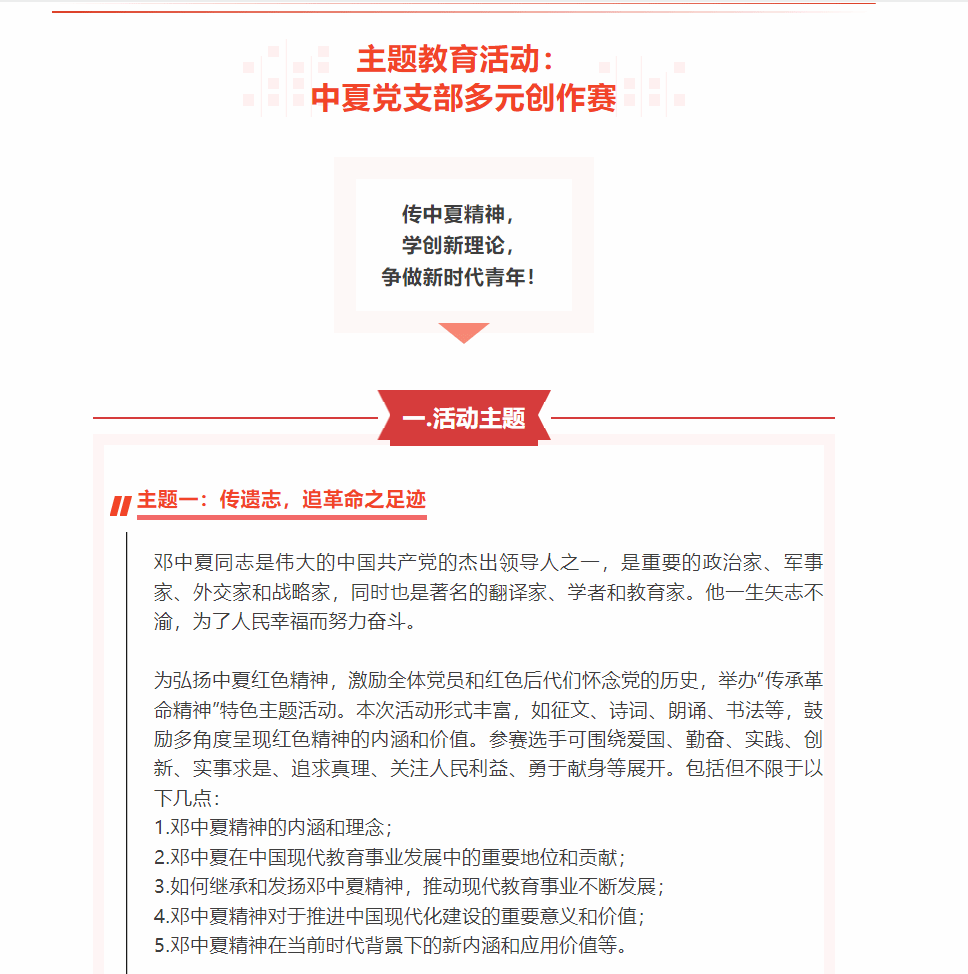 为弘扬中夏红色精神,激励全体党员和红色后代们怀念党的历史,2023年5月,法学院中夏党支部组织开展“中夏党支部多元创作赛”,旨在通过征文、诗词、朗诵、书法等多角度呈现红色精神的内涵和价值,进一步引导党员、学生坚定理想信念,激发大家的爱国热情和创新精神,为建设富强民主文明和谐美丽的社会主义现代化强国贡献力量。