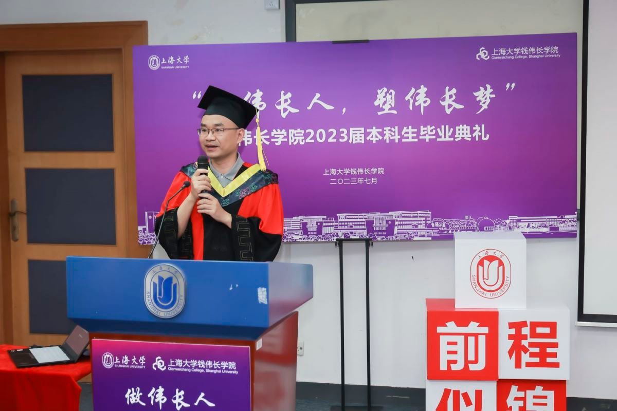 今年是钱伟长老校长诞辰110周年,在钱伟长学院2023届本科生毕业之际,伟长学子们精心制作了视频,以此表达对钱老的敬仰和怀念。紧接着,钱伟长学院导师代表宋亦诚为即将踏上人生新征程的毕业生们送上寄语。他嘱托同学们铭记钱伟长老校长的教诲,要做一个爱国者,要求真求实,要坚守学术道德,筑牢底线意识,希望伟长学子继续传承弘扬伟长精神,担当起对这个国家的使命与责任。