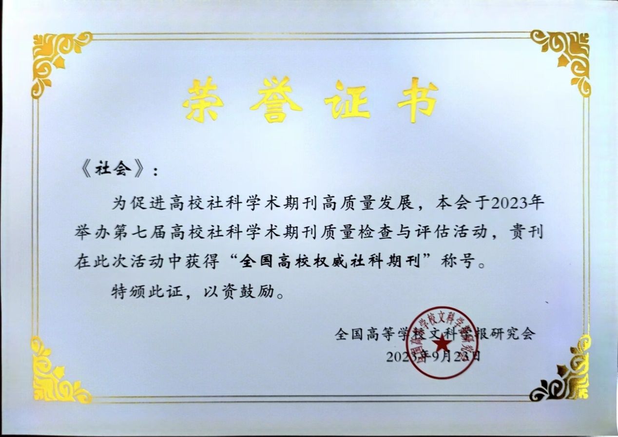 《社会》在第七届高校社科学术期刊质量检查与评估活动中喜获佳绩