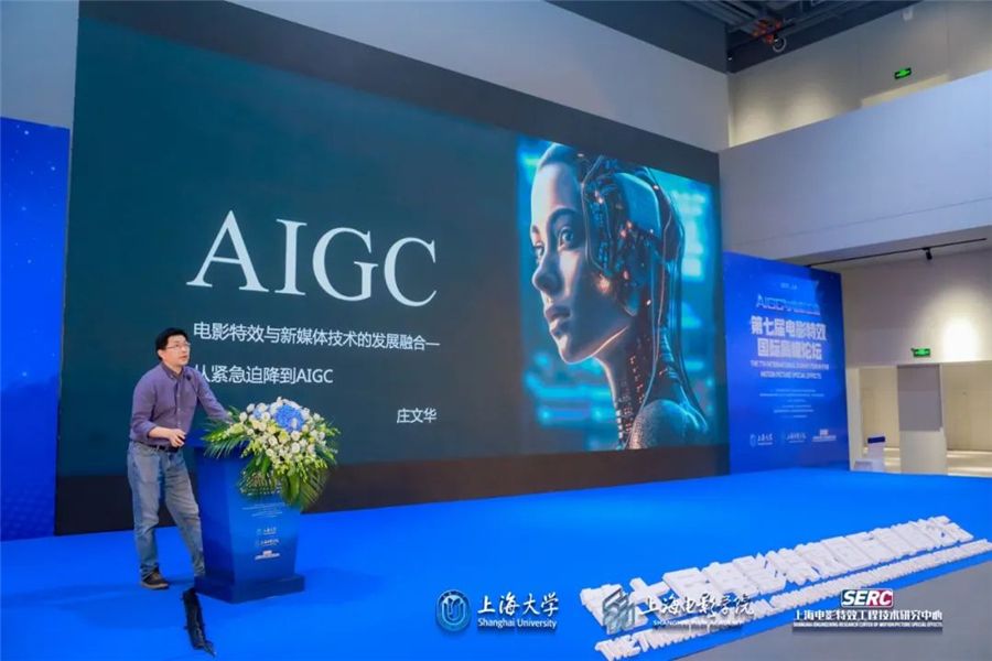 上海电影学院院长、上海电影特效技术研究中心主任何小青致辞。上海电影学院成立8年来,始终秉持“学院即是片场、艺术融合技术”的办学理念,植根本土、引领前沿、创新世界,注重主旋律作品的创作与研究,讲好新时代中国故事,同时积极贯彻学校五五战略,探索艺术与技术融合,促进中国电影工业提质升级。AIGC智能创作时代已来,我们要大胆拥抱,相信在各级领导大力支持和国内外技术专家共同努力下,融入AIGC新技术的中国电影工业将全力迈进新征程,迎来更大突破。