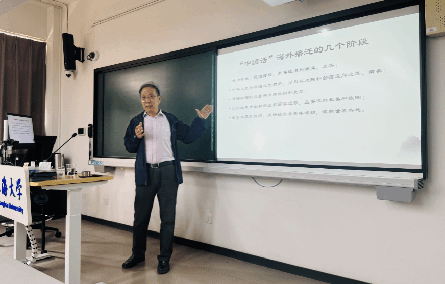 郭熙教授在讲座中主要谈了中国话走出去的历史、中国话在海外使用的现状、对海外中国话的研究情况、海外中国话与国际中文教育四个方面的问题。关于中国话走出去的历史,郭教授全面介绍了从晚晴时期、民国时期、中华人民共和国成立前后到中国改革开放初期及全面改革开放后,中国话在海外的播迁情况,所提到的马来西亚、新加坡等地中国话演变的典型代表性案例,非常有启发意义。郭教授还据此谈到了关于普通话、华语、中文三个概念界定及运用的情况。关于中国话在海外的使用情况,郭教授引用了大量实地调查的真实案例,指出不同时代移民群体的语言特点及华语传承情况,提到的“冷冻”32年的爪哇华语、居銮华语、“山东村”话等实例生动而有说服力。关于对海外中国话的研究,郭教授介绍了华语研究的兴起以及其中的一些代表性重大工程成果,如全球华语词典、全球华语语法研究等。