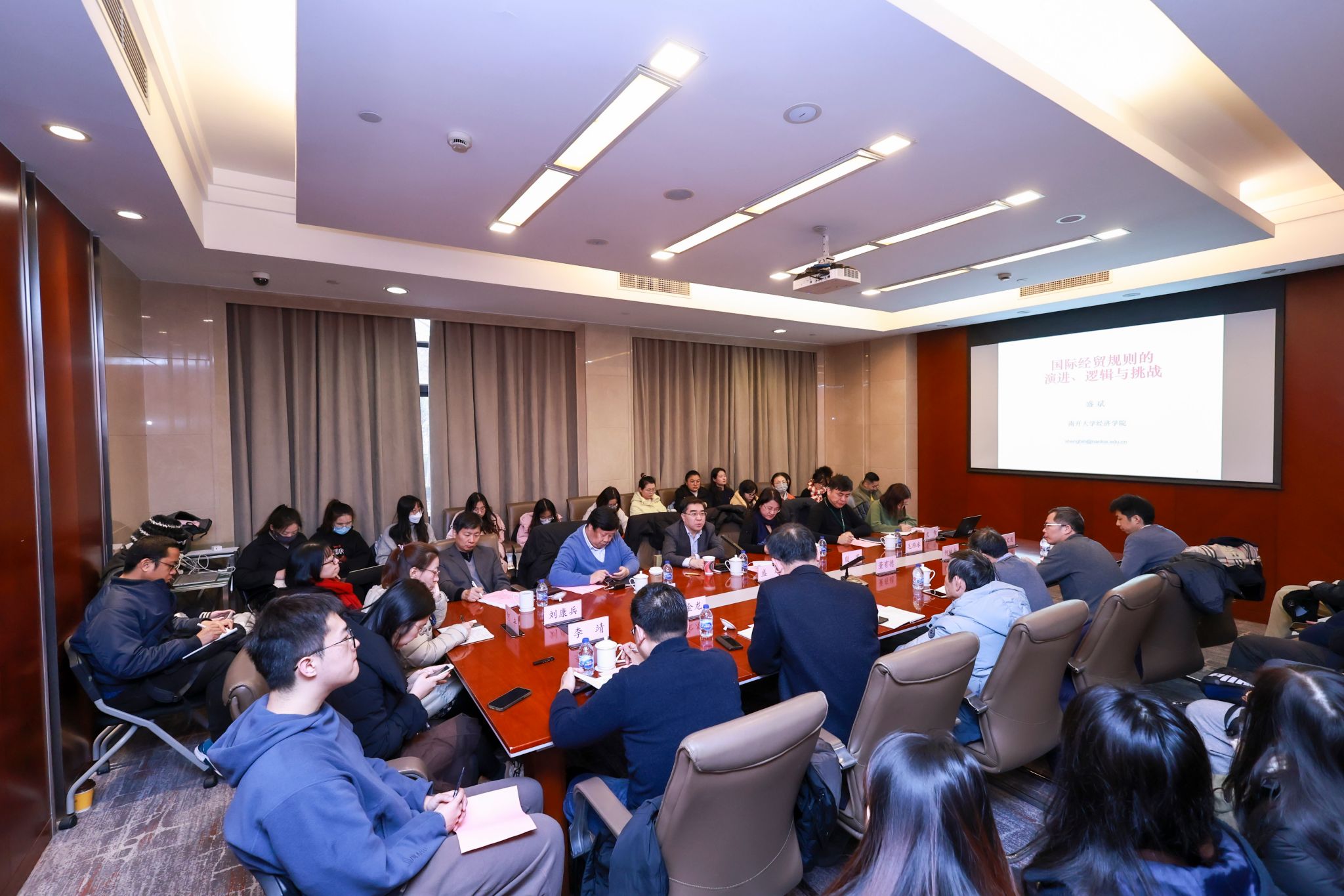 会议第一阶段,盛斌校长作了题为“国际经贸规则的演进、逻辑与挑战”主题讲座,首先盛斌校长通过“贸易模式演进与规则变革滞后并存、深度一体化与大国脱钩并存、多边体制脆弱性与区域/诸边主义大推进并存、贸易促进和平与贸易作为制裁手段并存”这四个并存,对全球经贸格局与体制的变化展开分析;接着他又从“底层政治经济学逻辑”、“如何制定与实施国际经贸新规则”这两个角度探讨如何重塑国际经贸秩序与规则。之后盛斌校长进一步分析了国际经贸新规则谈判与达成难的原因、国际经贸秩序的前景,以及国际经贸理论研究的挑战与启示等,并提出了中国对国际经贸新规则的立场与策略选择建议,如评估高标准经贸规则与国内立法之间的差距、顺应潮流与趋势,推进“制度型开放”、守住制度底线与利益红线、研究与寻求新规则的攻势利益与平衡点、维护多边贸易体制,在多边和区域框架下渐进有序推进新规则等。讲座最后,盛斌校长和与会老师们就一些国际经贸现实问题进行探讨,并一一耐心细致地解答了在座师生的提问。