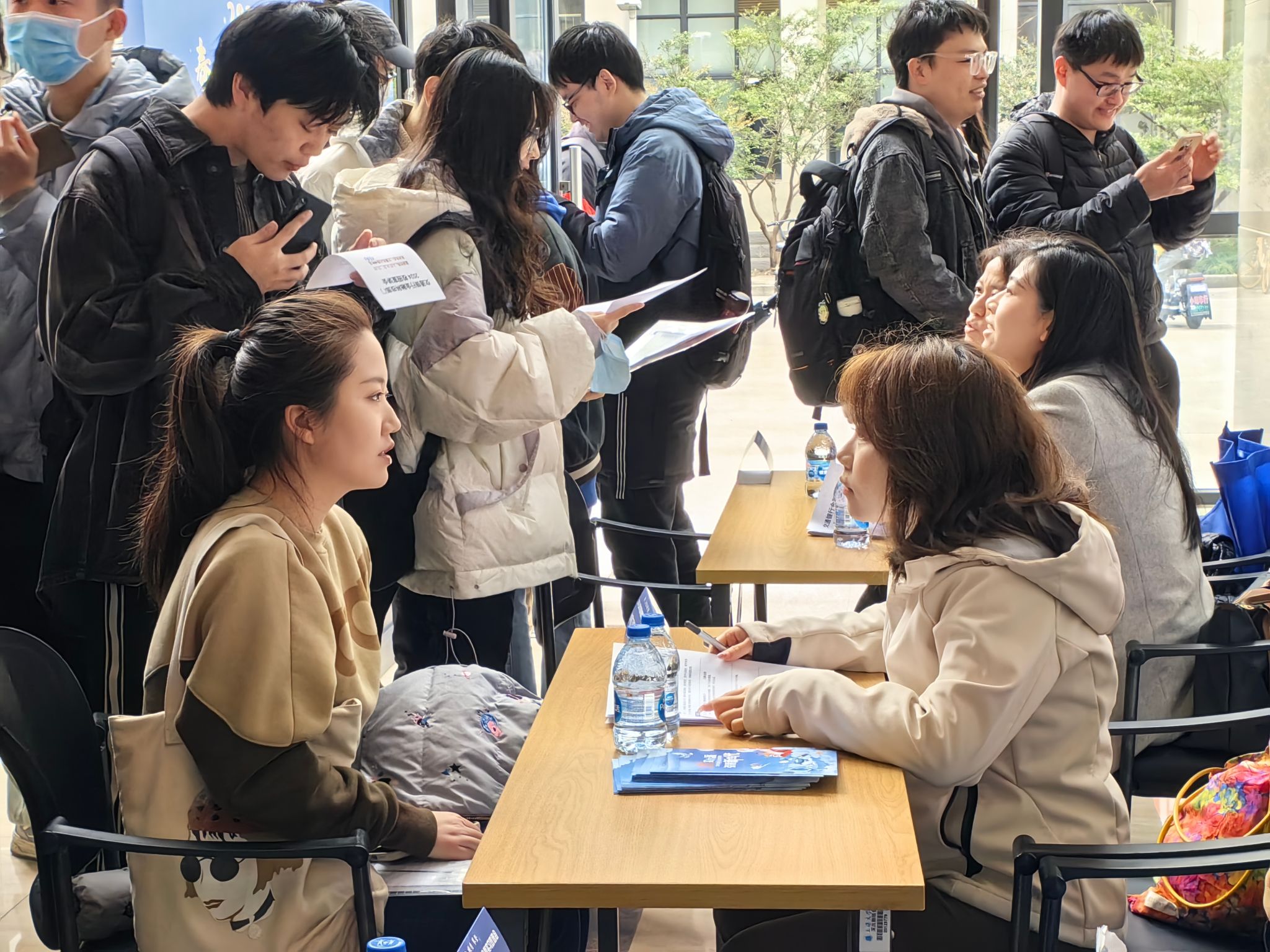 招聘会现场学生络绎不绝,气氛热烈。毕业生们手持精心准备的简历与企业招聘负责人交流沟通,就自身关心的岗位职责、薪资福利、发展前景等进行咨询。此外,部分2025届毕业生积极与意向单位的招聘代表洽谈,提前了解暑期实习要求及留用计划。用人单位热情、耐心地向我校毕业生答疑解惑,明确相关注意事项。