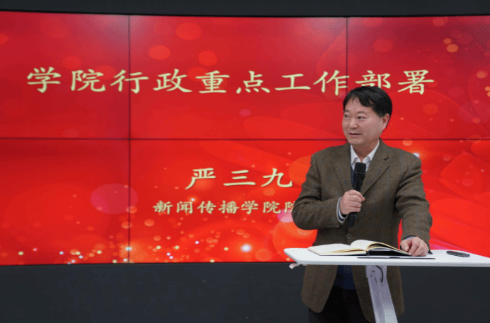 为认真贯彻落实习近平总书记关于教育的重要论述,着重落实学校相关部署,紧抓“聚力、提质、攀登”三个关键词,持续推进学院教育工作高质量发展。近日,新闻传播学院2024年度第二次全体教师大会在延长校区上海智能媒体传播创新实验中心顺利举行。校纪委(监察专员办公室)派驻延长校区专职纪检员田先纲,新闻传播学院党委书记王晴川,党委副书记、院长严三九,党委副书记、副院长王智君,副院长赵为学,副院长牛盼强,副院长周宇豪,以及学院全体教职工出席会议。会议由新闻传播学院党委副书记、副院长王智君主持。
