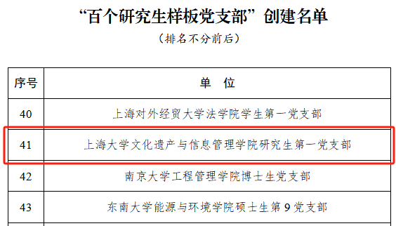 我校悉尼工商学院研究生经金党支部、力学与工程科学学院固体力学研究所党支部、国际部国际合作处党支部入选“全国党建工作样板支部”培育创建单位;文化遗产与信息管理学院研究生第一党支部入选全国高校“百个研究生样板党支部”。