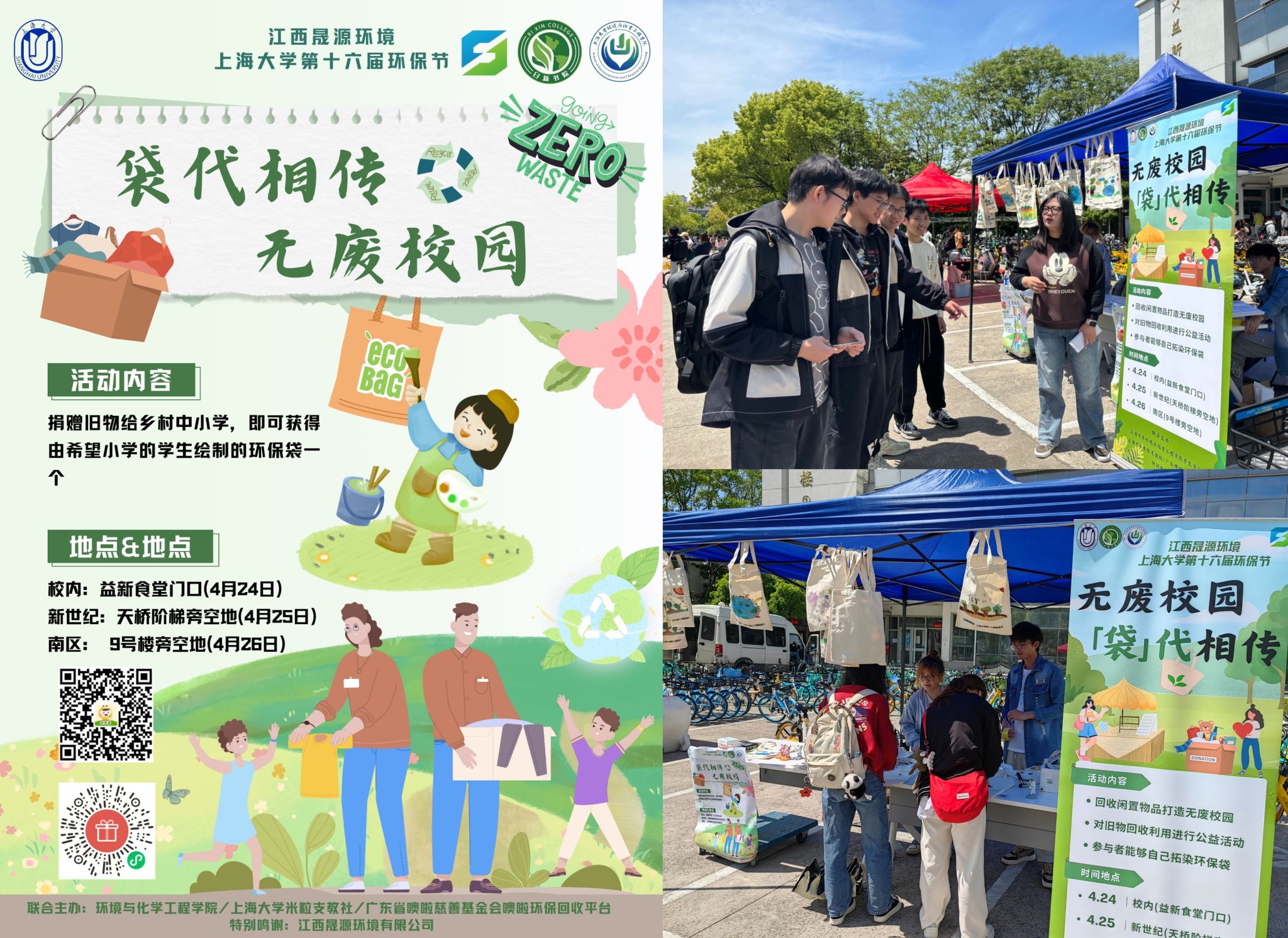 本届环保节系列活动“无废校园·袋代相传”于4月24日、25日、26日分别在益新食堂、新世纪宿舍、南区宿舍三个场地进行。同学们通过捐赠衣服、书籍等闲置物品换取由希望小学学生设计的环保袋,并领取电子证书、蚂蚁森林能量以及奖品。活动现场,同学们还可以尝试在环保袋上进行植物拓染,在感受属于大自然独特魅力的同时,制作出专属于自己的环保袋。本次活动得到了全校师生的热烈响应和支持,经统计,活动共回收物品313.18千克,其中包括衣帽160.22千克、书籍152.96千克。活动结束后我们将这份爱心传递给了贫困山区的儿童,赋予了这次环保活动独特的意义。