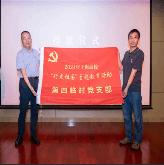 上海市学生事务中心副主任王涛为“行走”团队依次授予临时党支部旗帜。