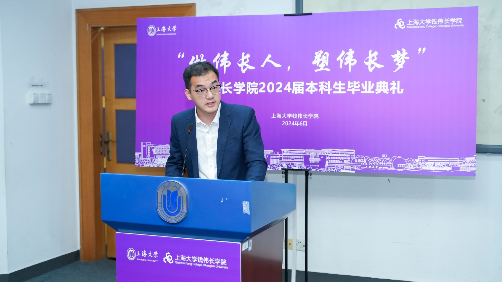 钱伟长学院导师代表姚锋平老师为即将踏上新征程的毕业生们送上寄语。姚老师和同学们共同回忆了从大一的第一次上课到大四的论文答辩情景,肯定了这届同学们因为困难,所以不易,因为不易,做到如此优秀,希望同学们能把这份优秀继续贯彻到底,直到永远!