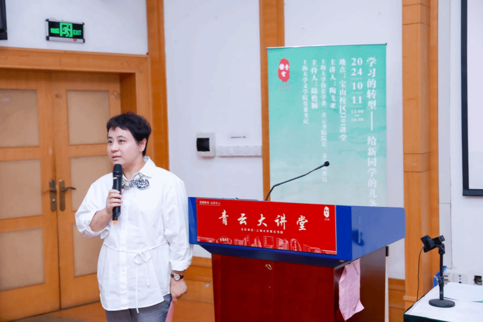 活动伊始,文学院党委书记陆甦颖对2024级青云书院本科生的加入表示欢迎,她向同学们介绍了青云书院的基本情况,并阐释了“青云大讲坛”立足大学生成长发展的人文需求,坚持深层次的文化思考和立足大学生成长发展的价值追求。她表示,在过去的两年,青云书院在学校书院管理中心的指导和支持下,在外语和文信两家学院的共同推进下,已经成功举办了“青云大讲堂”两季20期主题讲座,邀请了20位专家教授,听讲学生总数近4万人次,卓有成效。与此同时,陆书记也向同学们逐一介绍了“青云大讲坛第三季”的主讲嘉宾们,并隆重介绍了本次讲座主讲人青云书院院长陶飞亚教授的研究领域和主要成就。