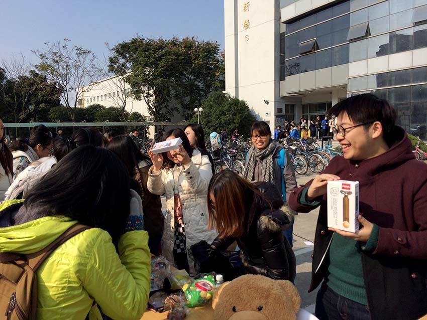 活动前一周我支部在上大信使、上大司令等平台对本活动进行宣传,校园里回荡着即将义卖的通告,党员和积极分子通过扫楼等方式加强预热,12月8日在益新食堂门口的义卖正式拉开帷幕,义卖现场十分火爆,主持人社的宋志超和刘玉莹高举广告牌在路口叫卖,提前录制的高大上中英双语音频更是吸引了人流,义卖的品种也很丰富精彩,各种波西米亚风、吉普赛风的首饰,化妆品,香水,台灯,小电扇,“鸟叔熊”等种类繁多的义卖物品纷纷引得路人上前挑选;此次义卖物品,大多是八九成新,还有很多全新的物品被募捐出来。广告系辅导员朱亦春老师也捐出了Teenine weenie的包包以及裙子、香水等物品,我们还在义卖物品中发现了卡西欧的计算器、lomo相机、实用的电卷棒、打蛋器等,义卖物品的质量可以说是相当之高。现场竞拍热心同学募捐的全新ipods Shuffle将整个活动推向高潮。原定两天的义卖一天就完美收官了,据义卖结束后的账目实时清点,当天总共卖出2201.4元。虽然党员和积极分子们在寒风凌冽中站得脚酸了,喊得嗓子哑了,但充满爱心的心情却是甜蜜的。