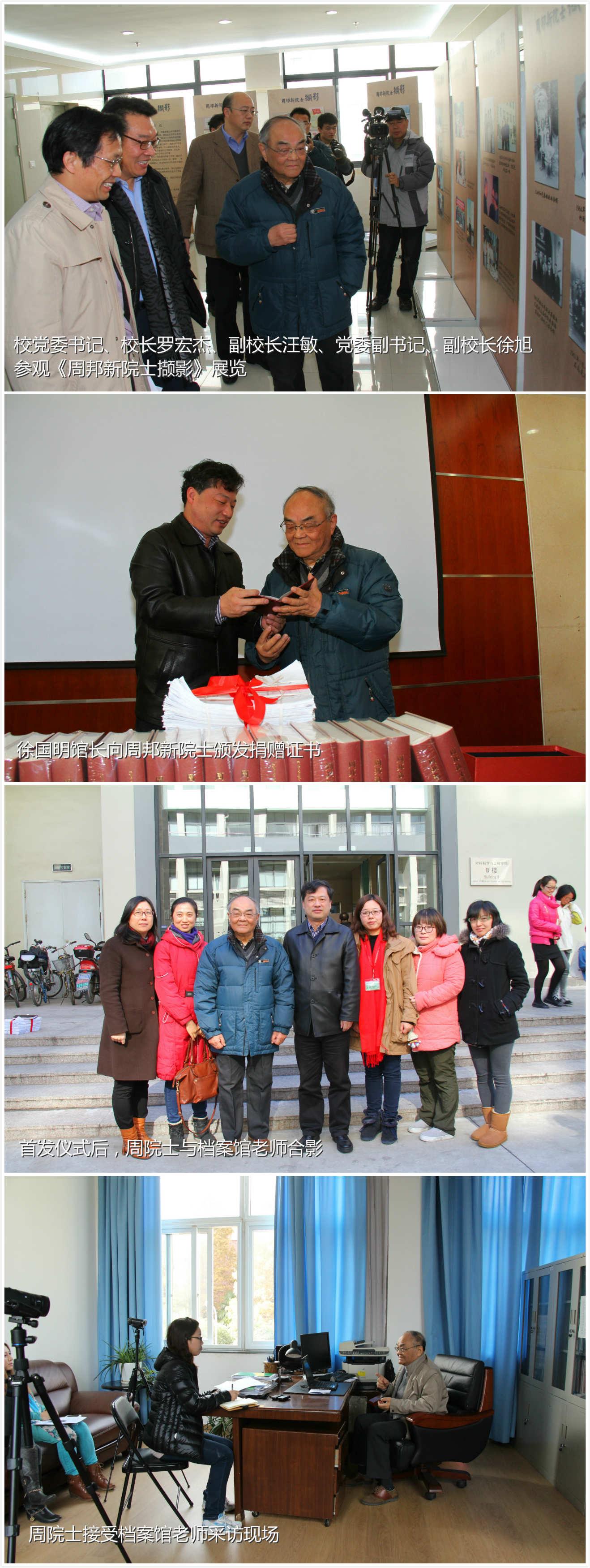 当得知材料学院将举行《周邦新文选》首发仪式,档案馆为丰富首发式内容,主动请缨,在会场外举办了《周邦新院士撷影》展览。此次展览由我馆洪佳惠老师在短短半月之内,利用馆藏照片档案设计、制作而成。展览勾勒了周院士简单而不平凡的经历,一经展出,得到了观展师生的认可与称赞。学校党委书记、校长罗宏杰、副校长汪敏、党委副书记、副校长徐旭也观看了该展览,并与周院士亲切交流。