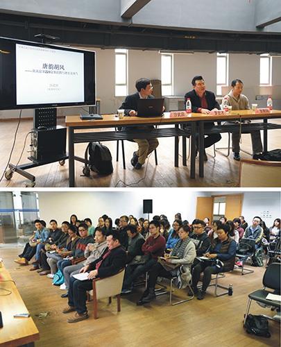讲座上,沙教授首先从敦煌莫高窟的历史背景和人文、自然环境切入主题,谈到了敦煌艺术研究的新趋势。然后集中以莫高窟第220窟舞蹈图案与唐代社会文化风气以及胡汉文化交融发展为重点,阐述了包括胡旋舞、第220窟舞蹈图案与长安唐墓壁画等胡旋舞图像、第220窟舞蹈图中的燃灯与长安上元日灯会、唐代夜间乐舞——以灯为中心的讨论以及第220窟维摩诘经变反映出的长安风气等内容,从而使莫高窟第220窟在中国绘画艺术史、唐史研究、唐代寺观画壁、中外文化交流史、唐代音乐舞蹈等相关学术领域的价值和意义得以凸显。