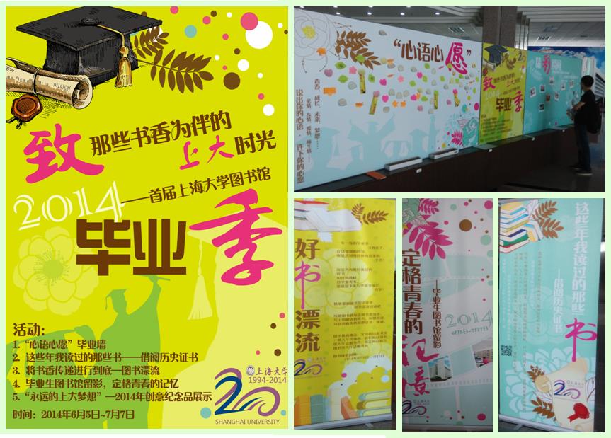 苦读时光匆匆逝,美好记忆永留存。图书馆将于6月5日至7月7日推出“致那些书香为伴的上大时光”为题的2014图书馆毕业季主题活动,“毕业寄语”让即将迈向新征程的你尽抒离情别绪,“借阅历史证书”记录图书馆生活中独一无二的你,“图书漂流”将书香一脉传承,“精彩瞬间”定格你的青春记忆......