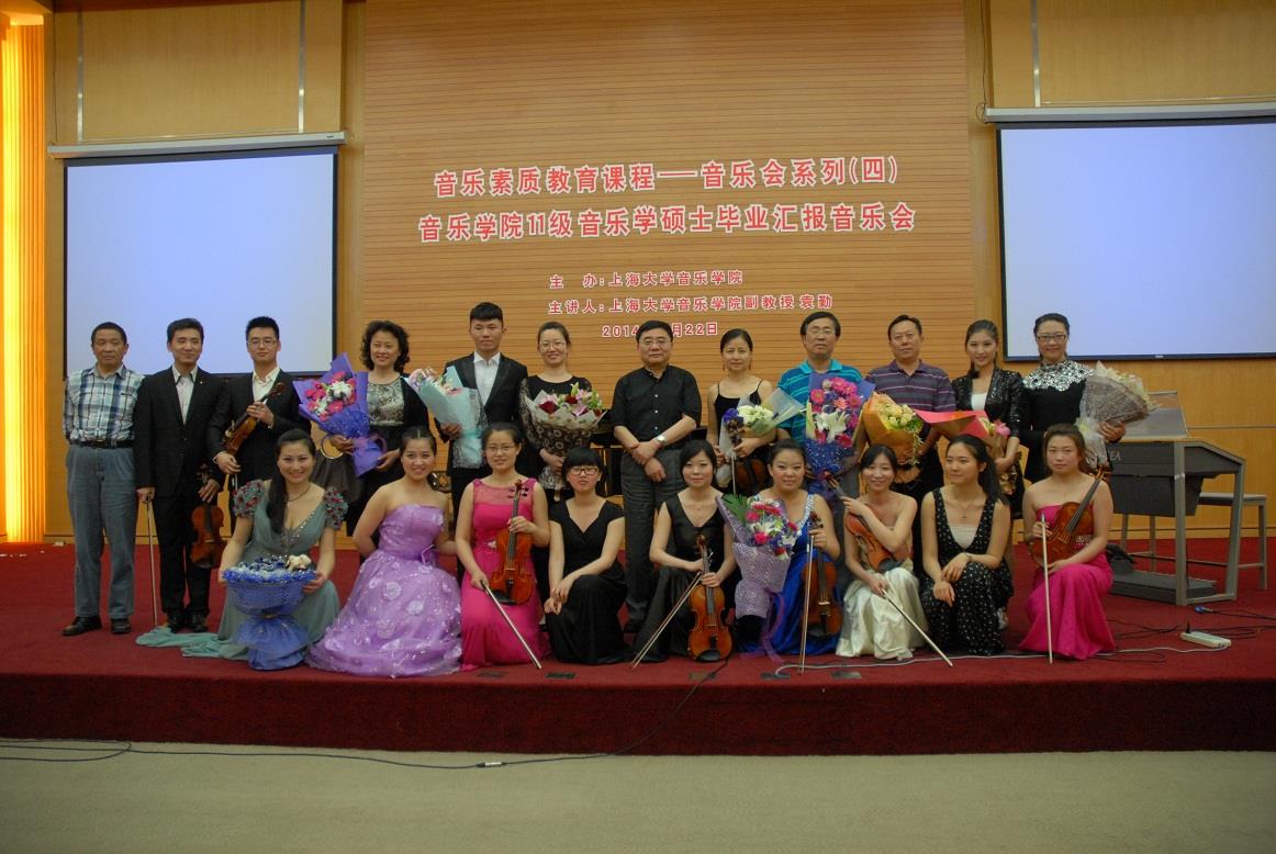 整场演出,袁勤老师的讲解深入浅出,幽默风趣,侧重点在于对一般音乐知识的讲解和普及,较少涉及艰深的音乐理论,这种主讲方式较容易被现场观众接受,获得了在场的老师和同学们的一致认可。各位11级同学也在李建林老师、王黎老师、殷默刚老师、夏小曹老师、刘朝老师三年的辛勤指导下,收获了即将毕业的喜悦。音乐会结束后,叶志明副校长对音乐会的成功举办表示了祝贺,并上台与参与演出的11级音乐学硕士同学们合影。