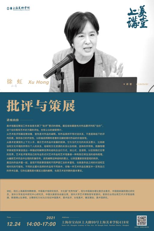 徐虹,现任上海美院特聘教授,中国美术馆研究馆员,文化部“优秀专家”。现为中国美协理论委员会委员,中国国家画院理论研究员,清华大学吴冠中研究中心研究员,中国女画家协会副主席,清华大学艺术博物馆专家顾问。曾担任台湾台南艺术大学客座教授,教授博士生课程。主要研究方向为20世纪中国美术,美术批评,女性美术,展览策划,美术馆研究。